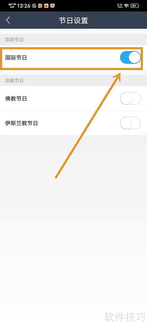 6、 进入节日设置页,开启国际节日功能即可。