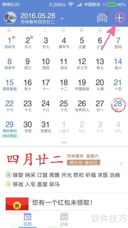 1、 打开中华万年历手机版6.5.1,点击右上角加号图标即可添加内容。