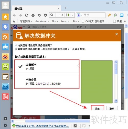 3、 打开冲突原因界面后,可查看本地与服务器数据的差异及解决方法。您可选择保留当前版本或使用本地备份,确认选择后点击好的,即可完成冲突处理。