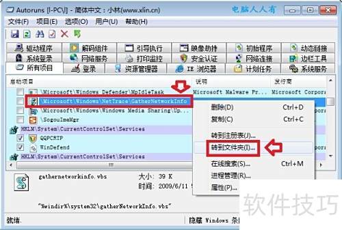 10、 可重点关注带有颜色标注的分项,例如gatherNetworkInfo,右键点击该项后选择转到文件夹,即可打开其对应路径,该路径位于C盘的Program FilesSystem32文件夹内,便于快速定位和查看相关文件内容。