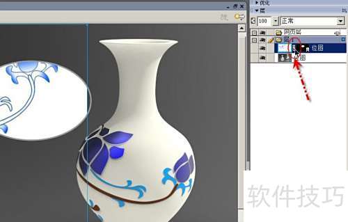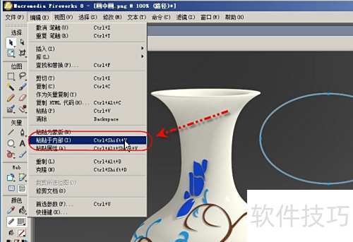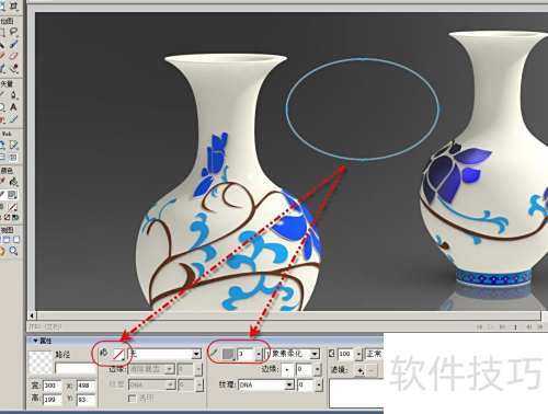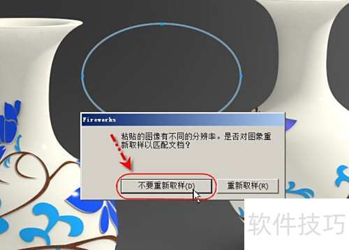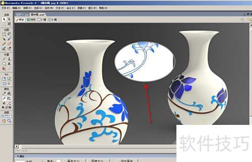1、 使用Fireworks打开图片,在两个瓶子之间添加一个椭圆形画中画,用以展现瓶子表面的花纹细节。