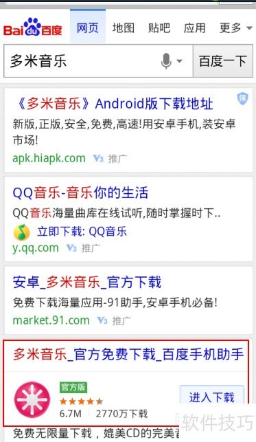 1、 手机网络搜索多米音乐下载