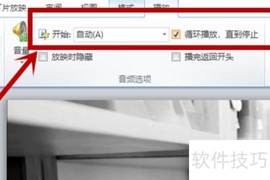 弹出对话框选择自动,PPT中将显示小喇叭图标。选中小喇叭,点击声音工具下的选项,勾选循环播放直至停止,并启用放映时隐藏。
