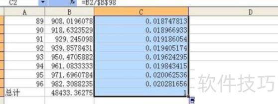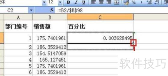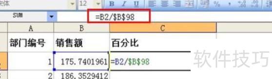 在C2单元格中输入公式 =B2/$B$98。其中,符号$的作用是锁定单元格引用,使其在复制公式时不随位置变化而改变。当我们把C2中的公式复制到其他单元格时,公式中的相对引用会自动调整,但带有$的绝对引用则保持不变。例如,公式中的B2是相对引用,复制时会随之变化;而$B$98中的行和列都被锁定,始终指向销售总额所在的B98单元格,确保计算准确无误。