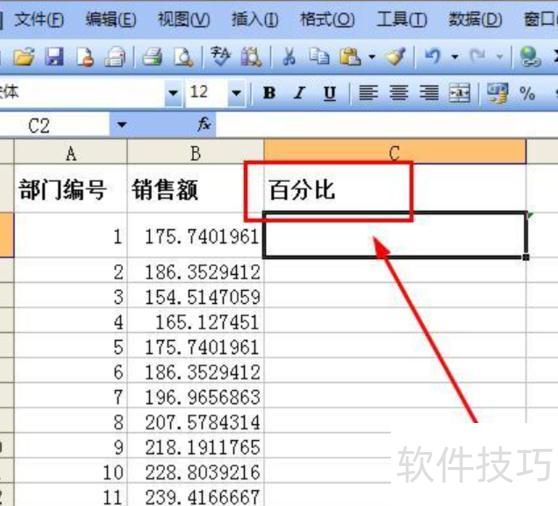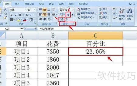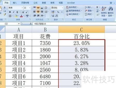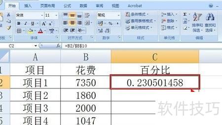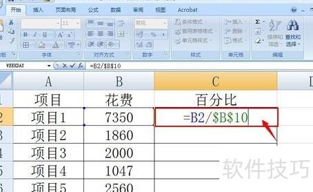 点击C2单元格,输入公式=B2/$B$10,表示将B2单元格的值除以B10单元格的值,其中B10采用绝对引用方式。