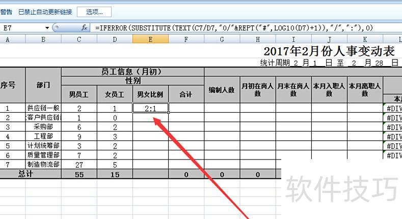 接下来需进行比例计算,明确分子与分母的关系,例如C7除以D7。完整公式为:=IFERROR(SUBSTITUTE(TEXT(C7/D7,0/&REPT(,LOG10(D7)+1)),/,:),0),该公式通过文本格式化将数值转换为分数形式,并用冒号替代斜杠,若出错则返回0。