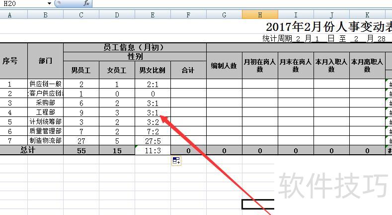 选中该单元格并下拉填充,即可复制公式,各部門男女比例便能自动显示。