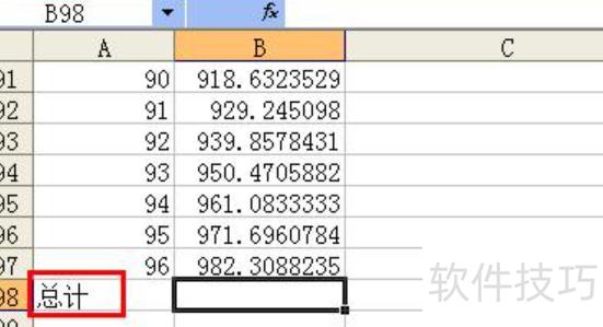 在A98单元格输入总计,并对下方数据进行汇总。