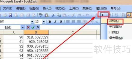在B98单元格点击右侧工具栏中的求和按钮。
