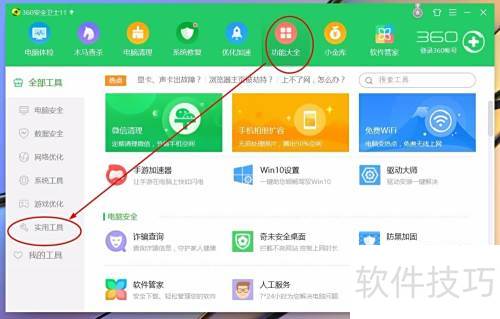 1、 进入360安全卫士后,选择功能大全选项。