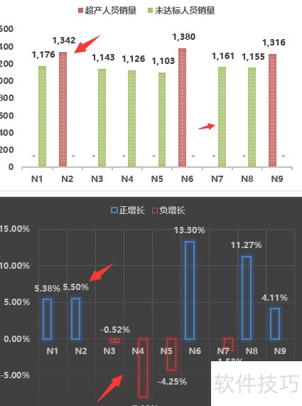 7. 墨墨复制数据可自动生成差异柱状图,超产或未达标、正负增长均以变色柱状图直观呈现。