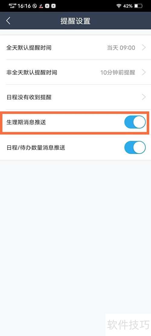 3、 进入设置页面,开启生理期提醒通知即可接收推送。