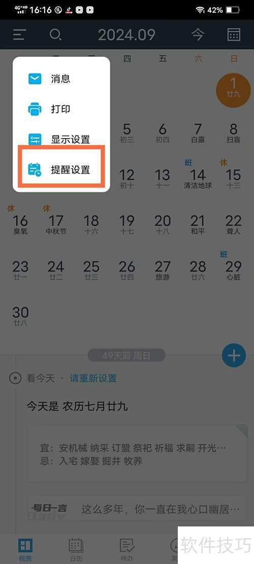 2、 在弹出的菜单中选择提醒设置选项。