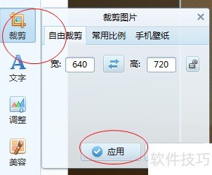 3、 在左侧工具栏点击裁剪按钮,设定所需区域的宽度和高度像素值,确认后点击应用,操作所示。
