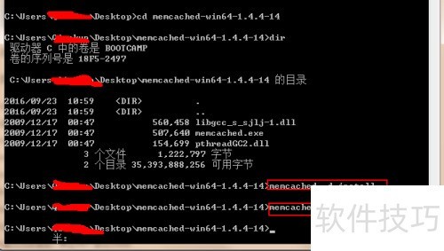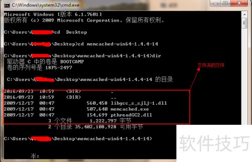 4、 进入 memcached-win64-1.4.4-14 目录,使用 dir 命令查看该文件夹中的所有文件。