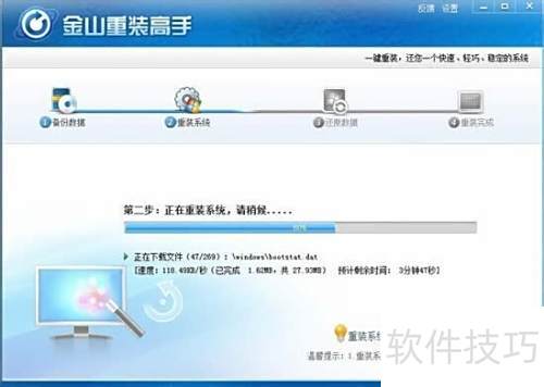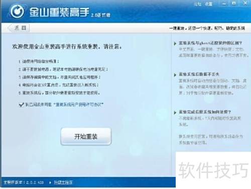 2、 在网上搜索并下载金山重装高手软件,安装过程简单快捷,按提示操作即可完成,随后即可启动使用。