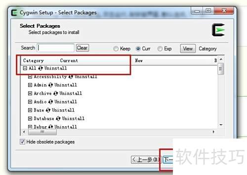 2、 进入选择软件包界面,在类别中选取卸载,然后点击下一步继续操作。
