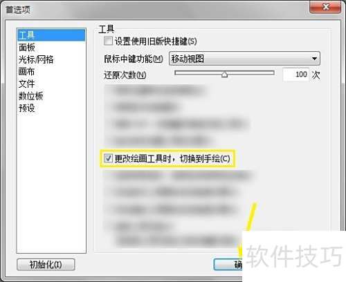 2、 在首选项界面,启用更换绘画工具时自动切换至手绘模式的选项。