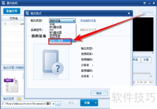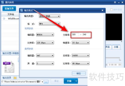 6、 在自定义参数界面,选定mp4格式,并设置视频分辨率。