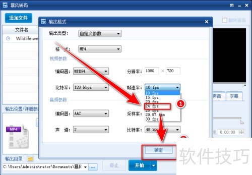 8、 从下拉菜单中选择24fps,然后点击确认。