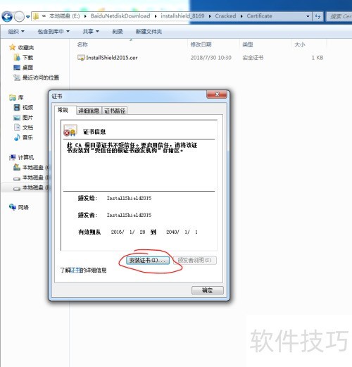 11、 打开 InstallShield2015.cer 文件,随后选择安装证书进行操作。