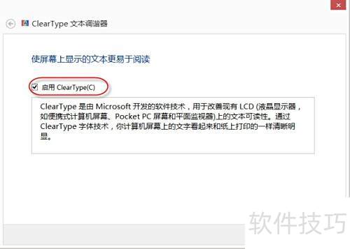 4、 打开ClearType文本调谐器窗口,选中启用ClearType选项,然后点击下一步按钮继续操作。