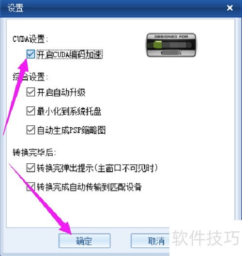 4、 在设置弹窗中,勾选CUDA设置里的开启CUDA编码加速选项,点击确定即可完成操作。