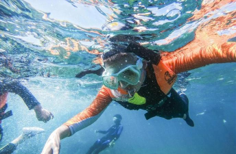 浮潜不需要太多技巧,你甚至不用会游泳,只要穿上救生衣,戴上面镜和呼吸管,就能趴在水面上,低头看海底的珊瑚和小鱼,特别适合在热带海岛,比如东南亚的海边,海水清澈,鱼群也多,体验非常好,不过,浮潜只能看到浅海,大概几米深的地方。