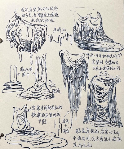 再看形态把握岩浆的形态,是流动的,它不像固体,有固定形状,画的时候,要画出那种,缓缓流动的感觉,可以想象成,融化的巧克力,或者粘稠的蜂蜜,表面要有,起伏的波纹,甚至鼓起,一些气泡,边缘不要画得太整齐,要有些,喷溅和滴落的效果。