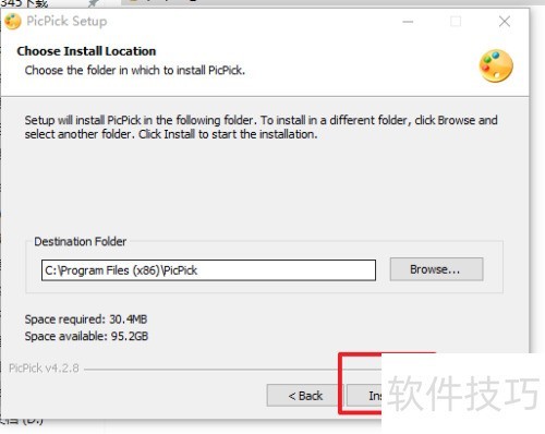 2、 下载完成后,双击运行picpick.exe文件,启动安装程序。安装过程十分简单,只需连续点击下一步,选择任意磁盘作为安装位置,确认后点击Install按钮,系统将自动完成后续安装步骤。