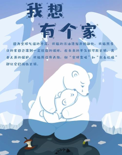 北极熊的家,是海冰,全球变暖,让冰融化得很快,它们捕食困难,生存空间变小,所以,减少碳排放是关键,我们少开一次车,多坐公共交通,就是在帮忙。