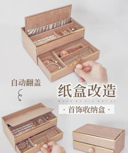 设计好了,就可以动手了,先用硬纸板,剪出盒子的底板和四壁,然后,用胶水粘起来,接着,用布料把盒子包起来,这样会更美观,在内部贴上绒布,或者,用卡纸做出隔断,一个基础的首饰盒,就基本完成了。