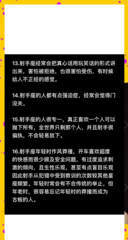 射手座的人很乐观,好像没什么烦恼,他们天生爱玩,对世界充满好奇,总是想去看看,新鲜事物最能吸引他们,所以射手座的朋友很多,各行各业都有,他们不喜欢被束缚,讨厌条条框框,如果你管得太紧,他们反而想逃,不过他们心地善良,没什么坏心眼,说话也比较直接,有时候会得罪人,但他们自己并不知道。