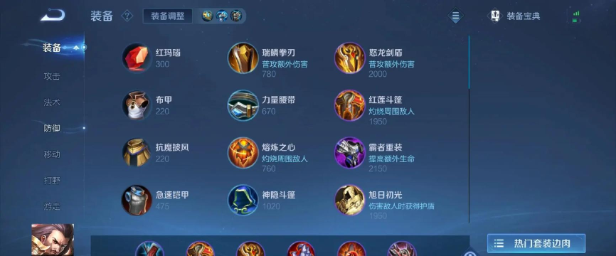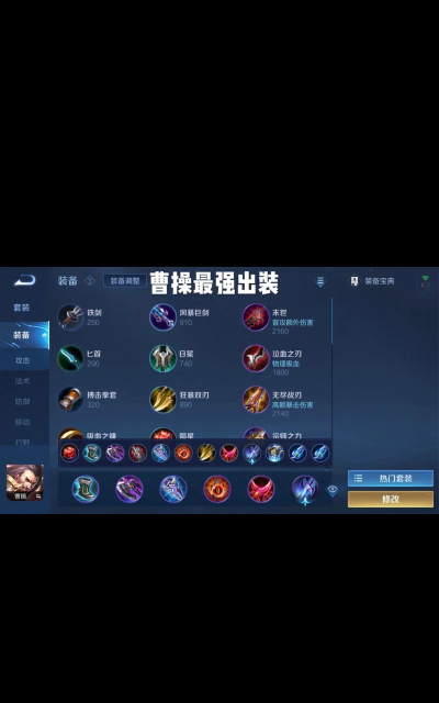 曹操的定位,是战士兼刺客,所以,装备必须兼顾生存和输出,纯输出装太脆,纯肉装又没伤害,半肉出装,才是他的主流选择,核心思路就是,用一两件输出装打伤害,再用防御装来保命。