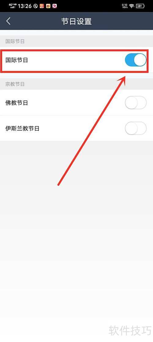 3、 进入节日设置,开启国际节日选项,即可享受闲趣时光。