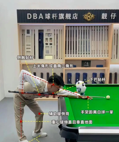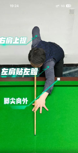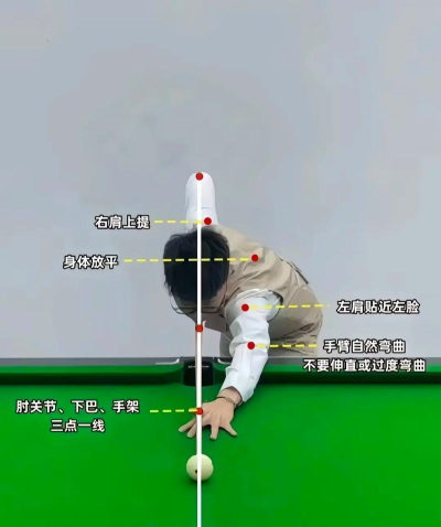 双脚分开站稳,身体微微前倾,重心要放低,左手架杆要稳,右手握杆放松,眼睛盯着母球,目标对准球堆。