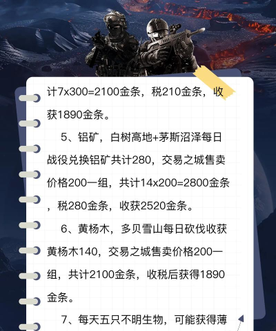 游戏里经常有活动,比如辐射高校,和莱文市黎明区,参与这些活动,能获得稀有材料,和专属奖励,你可以把活动奖励,挂到交易市场,比如高分子涂层,和薄膜面料,这些材料很抢手,能卖个好价钱,另外,关注营地巡逻,和夏尔镇争霸赛,也有机会赚取金条。