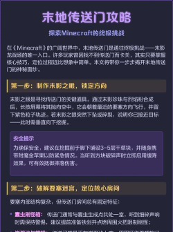 末地传送门是关键,它藏在要塞里,要塞通常在地下,或者山里,你需要先找到要塞,才能找到传送门,怎么找要塞呢,可以用末影之眼,末影之眼会飞,跟着它走就行。
