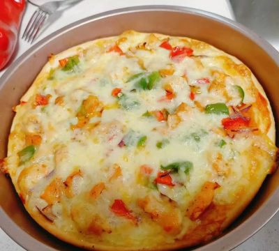自己做的鸡肉披萨,料足又新鲜,趁热切开还能拉丝,比买的划算多了,下次朋友来家里,露这一手绝对有面子,赶紧试试看吧。