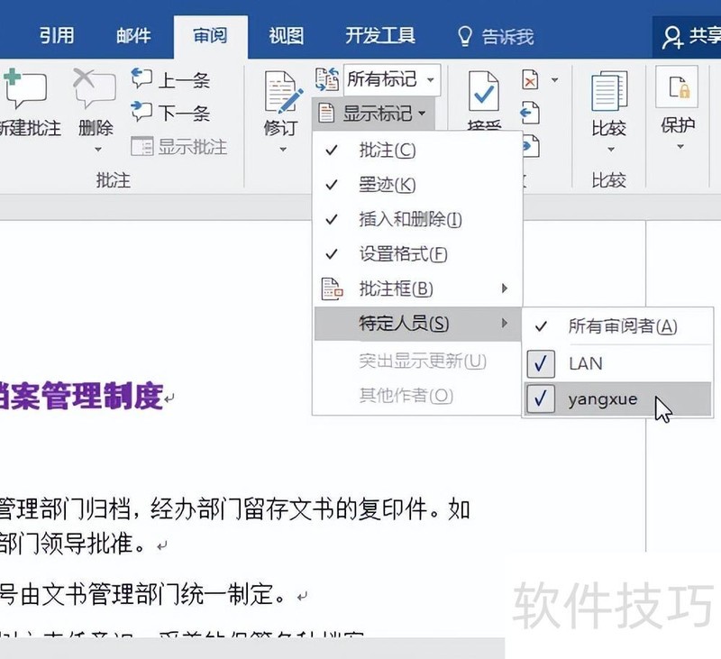 切换至选项卡,点击组中的按钮,在下拉菜单中选择。在级联列表中设定需显示的审阅者。本例仅需显示的批注,因此取消勾选,使其批注内容不显示,从而只保留指定用户的修订信息。