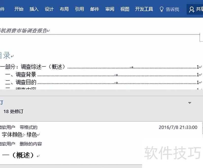 文档的批注和修订内容可在窗口下方的审阅窗格中查看。
