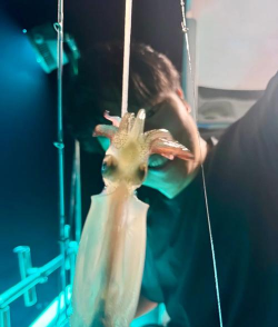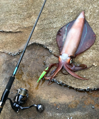 最后是钓鱿鱼的手法,抛投后要收线,动作要慢一点,模仿小虾游动,偶尔停顿一下,鱿鱼就会攻击,感觉有拉扯感,就要快速提竿。