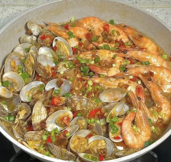 接着是炒制底料,锅里放少许油,下姜片、葱段爆香,喜欢辣的可以加干辣椒,然后放入海鲜,比如虾和贝壳,快速翻炒几下,炒到虾变色,贝壳开口,这样能激发鲜味。