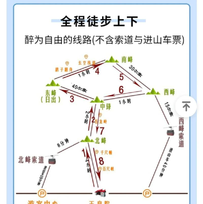 一日游比较赶,建议索道上下,重点玩西峰和南峰,两日游就从容多了,可以在东峰住一晚,第二天看日出,记得提前订好山顶住宿,旺季经常爆满。