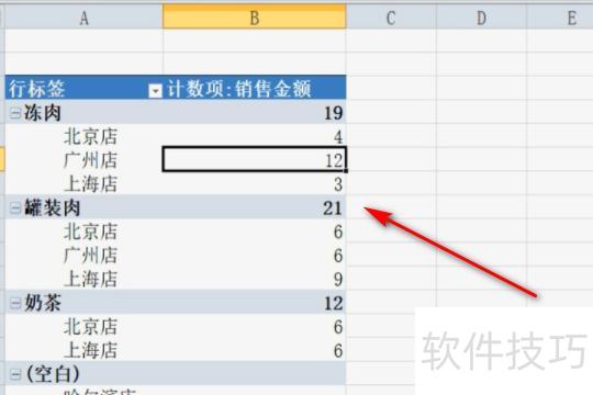 首先启动Excel,以插图素材为例,清除数据透视表中的(空白)项。其中表1为原始数据,表4为生成的数据透视表。切换至数据透视表所在工作表,点击透视表内任意单元格,上方随即显示数据透视表工具选项。