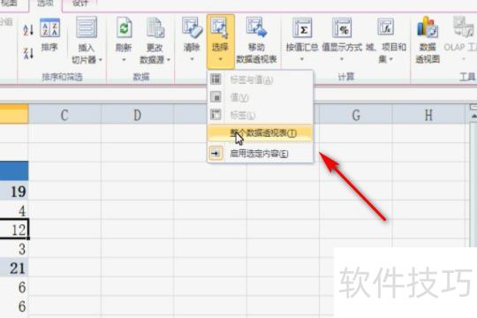 点击选项,选择操作中的选择,再从下拉菜单中点击选择整个数据透视表。