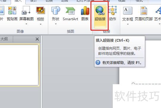 以PPT2010为例,点击上方插入选项卡,找到并点击菜单栏中的超链接图标即可。