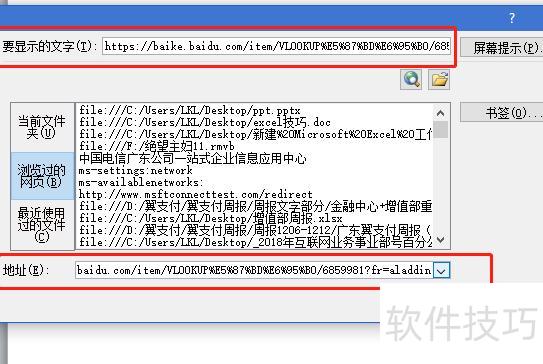 在插入超链接对话框中,选择浏览过的网页,右侧可选网址,或直接在下方地址栏输入目标网址即可完成设置。