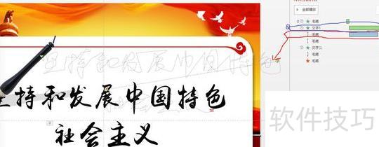 先将文字按笔画拆分(可用AI处理并导出为WMF格式,导入PPT后取消组合),随后为每笔画添加擦除动画,同时为对应毛笔设置路径动画。