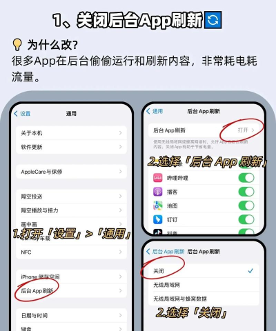后台活动管理很多应用在后台悄悄运行,非常耗电,进入设置,找到通用,点开后台App刷新,你可以选择关闭它,或者只允许重要的应用刷新,比如微信,这样能阻止不必要的后台活动,显著节省电量。